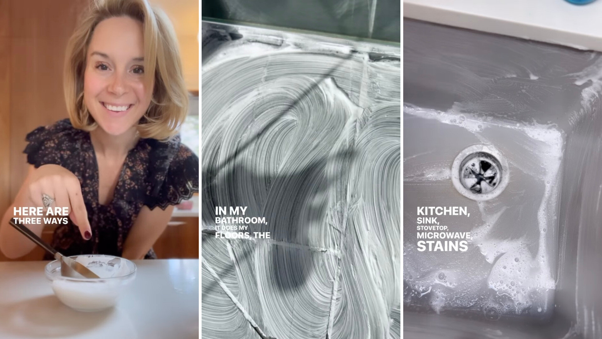 In the video, she instructs how to add a cup of baking soda to a bowl with ¼ cup of Castile soap. She also notes users can thin out the paste with a tablespoon of water or add a soft lemon aroma with essential oils.