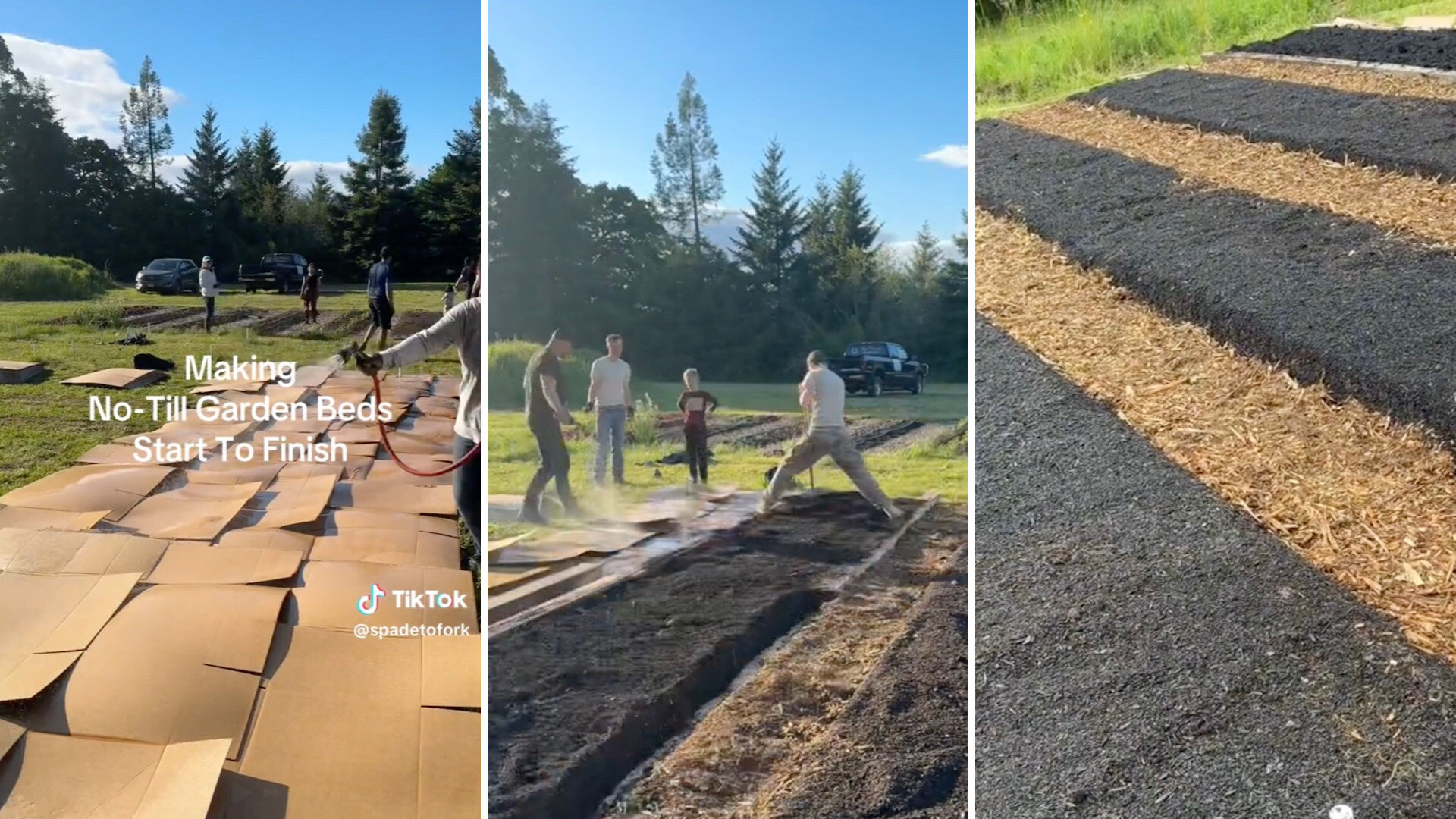 The video from TikToker Spade To Fork (@spadetofork) shows a step-by-step walkthrough of the no-dig garden bed method. First, the gardener lays out plain, untreated cardboard in rows to shape where the garden will go. The cardboard is soaked with water to help it break down faster and then topped with nutrient-rich soil. Between the garden rows, the creator lays down organic mulch, which helps prevent weeds from joining the party while locking in moisture.
