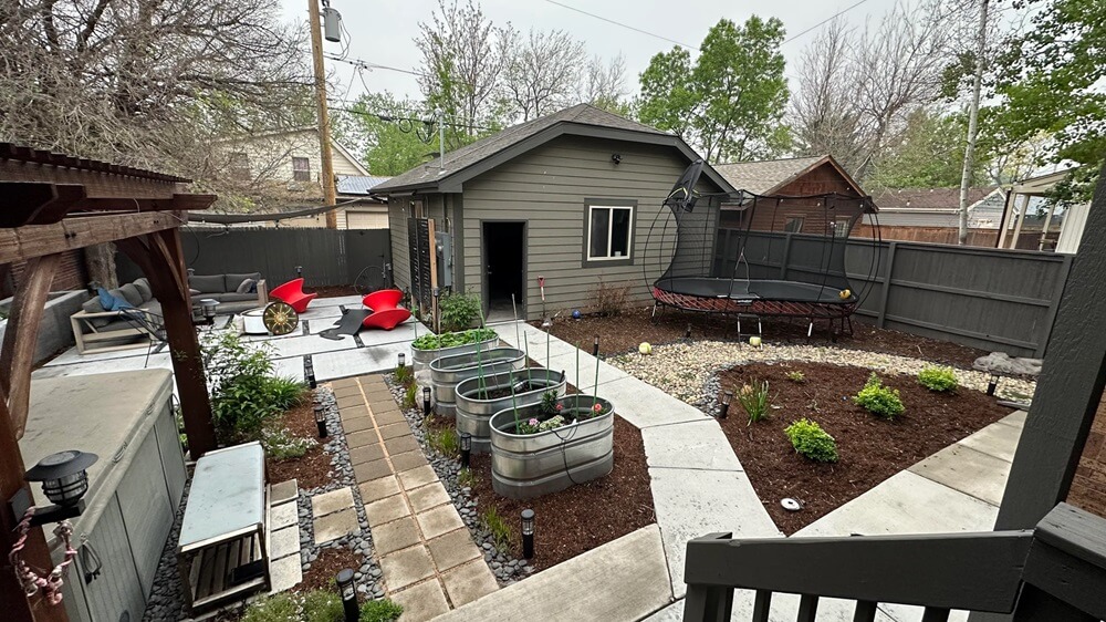 Then, they remade the yard to suit their personal taste. While a boring grass lawn is seen in the before image, the after photo shows raised metal planters, gravel and flagstone paths, mulch beds with plants and shrubs, and more outdoor lighting. The new layout even has a dedicated path leading to a trampoline.