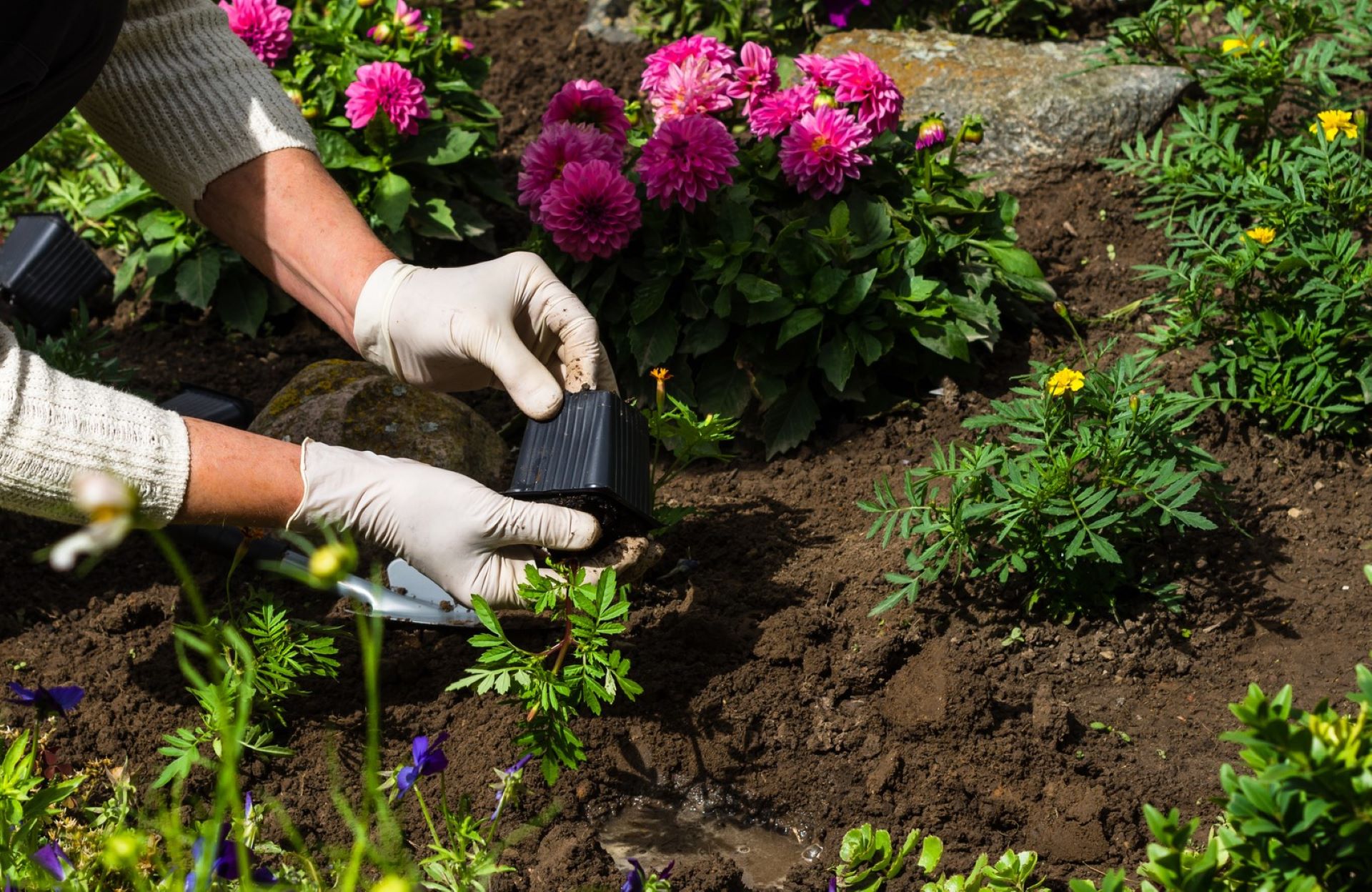 Even in the small snapshot, hundreds of flowers were visible, along with thriving bushes, trees, potted plants, and thick ground cover. A few tufts of healthy, unmowed grass were scattered between a mixture of other species, including clover and strawberries. The old-fashioned well pump and charming stone bench added to the impression of a fairytale garden.