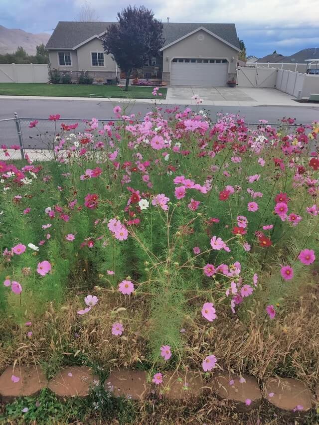 They shared several photos of their project, a brick-edged flowerbed that seems to take up about a third of what was once a front lawn. Sunflowers line one edge of the bed, their ripe seedheads drooping, while wildflowers grow thickly throughout the rest. Grass remains around the outside of the bed, but another section of lawn next to it has been covered with a tarp to kill the grass for a future expansion.