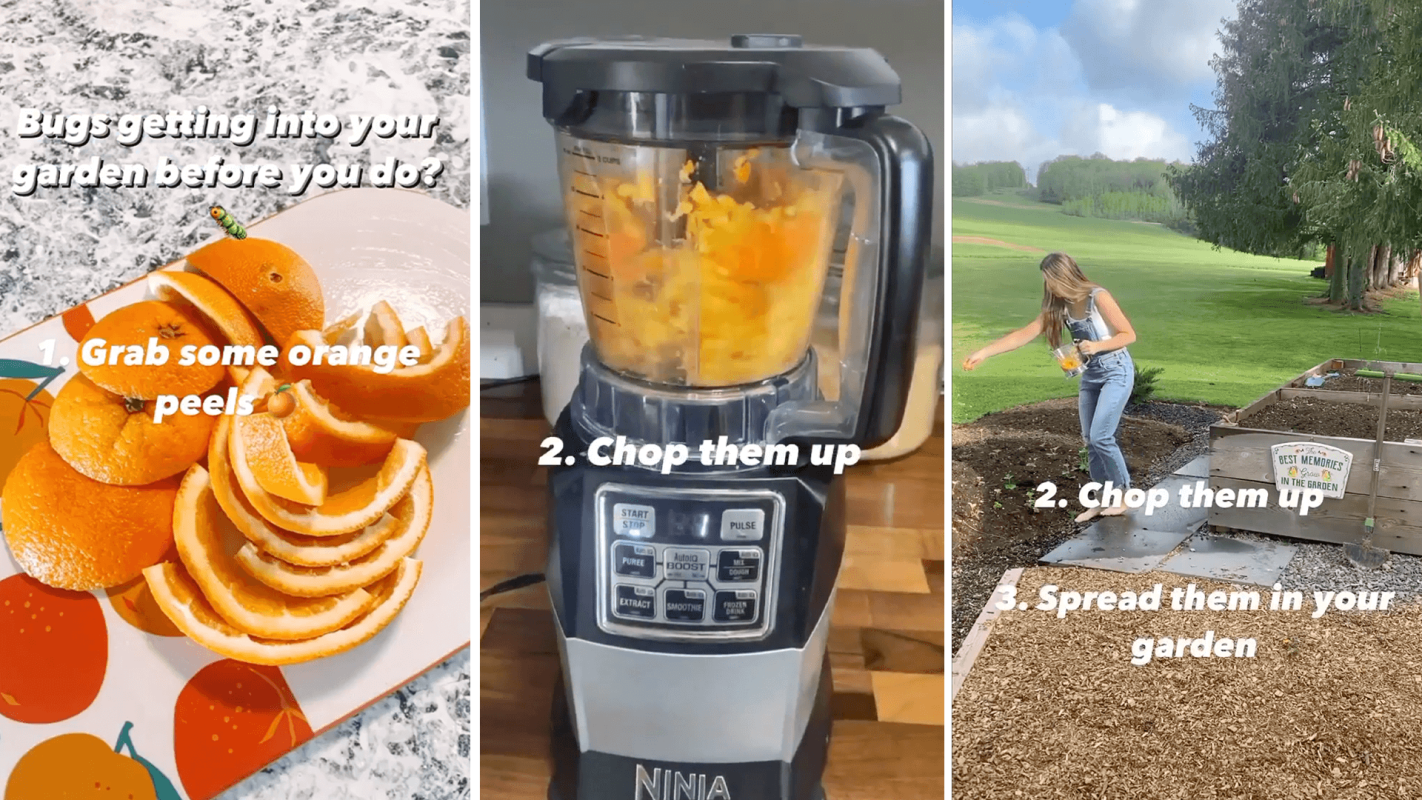 Murray boils orange peels in chunks to create a concentrated orange water that she sprinkles on her plants before putting the orange pieces directly in the soil as well. In her TikTok, she explains that the orange water keeps away aphids, flies, slugs, snails, and ants; and as an added bonus, the oranges contain calcium, magnesium, sulfur, and nitrogen, which help plants flourish.