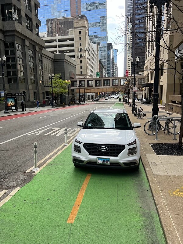 In the post were two photos of a car parked square in the middle of a bicycle-only lane, clearly marked by the green paint and bollards. This is all to say that the odds of a person parking in this spot on accident are incredibly low — they knew what they were doing.