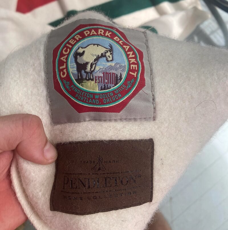 Remarkably, the official branding is intact. It is a white blanket with multicolored stripes on either end and belongs to the Glacier National Park collection.