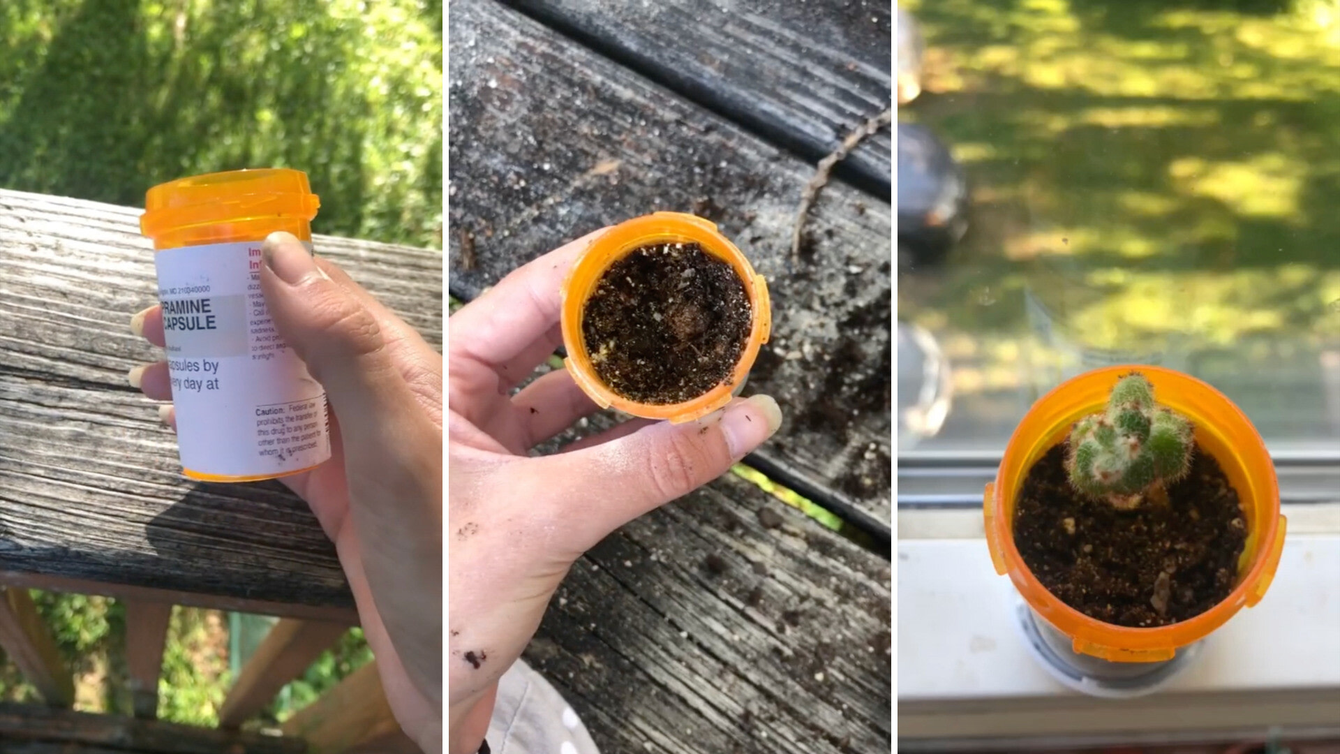 In the video, she demonstrated that you can easily fill up empty prescription medication bottles with a soil mixture and plant seeds in them or a plant that has already started growing.