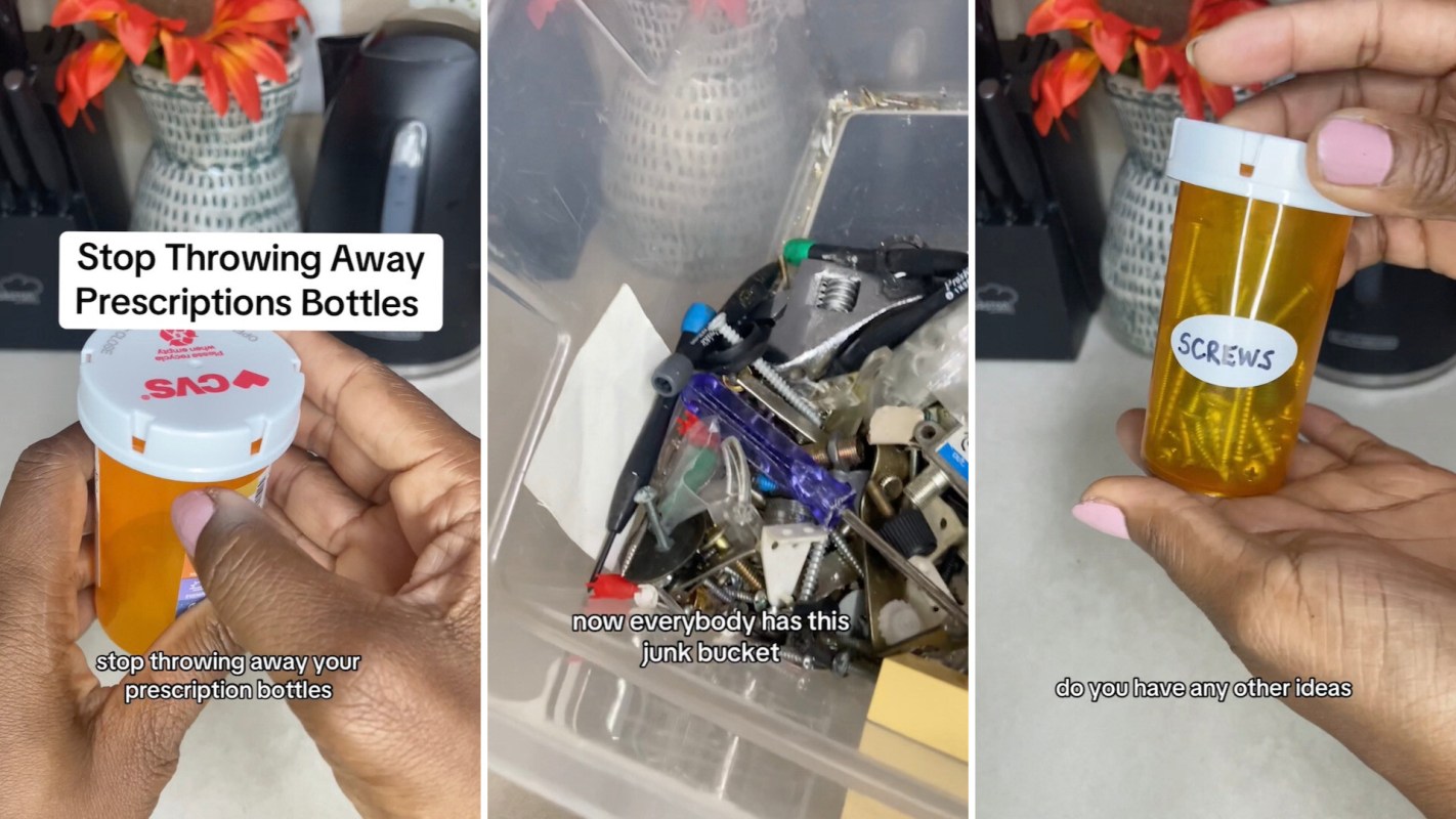 "Everybody has this junk bucket [or] junk Tupperware," she continues, showing her own plastic tub of assorted odds and ends. "I have a lot of screws in it, so I'm going to store all my screws in [the pill bottle]."