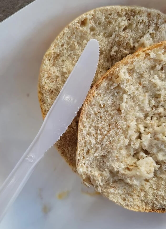 In the photo they included, there was a small bread roll that had been cut in half. On top of it was a plastic knife. The plastic was extremely thin, and the edge was visibly damaged from cutting the bread, with many of the teeth bent or broken off.