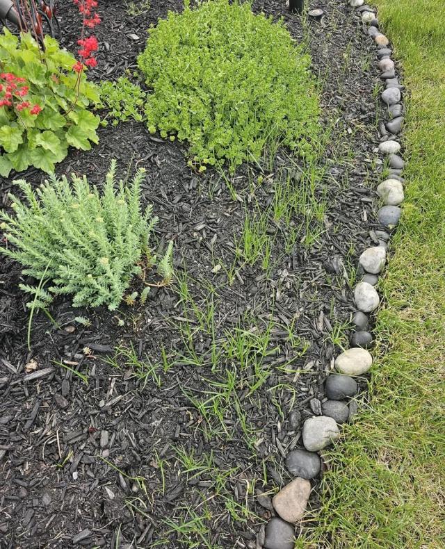 "About a month ago, I pulled all the grass along the edge of this garden bed, trying to get as much of the roots out as possible," said the original poster. "This is what I'm looking at today. Does anyone know of a way to eradicate the grass without damaging my other plants?"