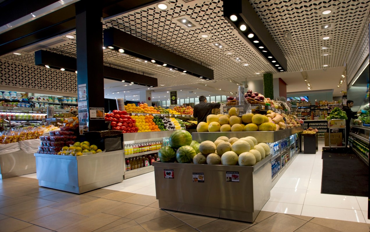 The picture shows large trays of limes, small trays of lemons, and bags of lemons. The trays are styrofoam swathed in cling wrap, and the bags are printed plastic.