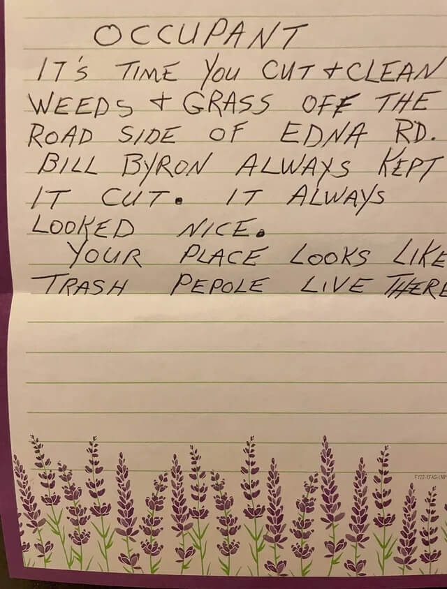 "Your place looks like trash people live there," reads the note. Its sender demanded that the homeowner cut the grass and weeds they have allowed to flourish.