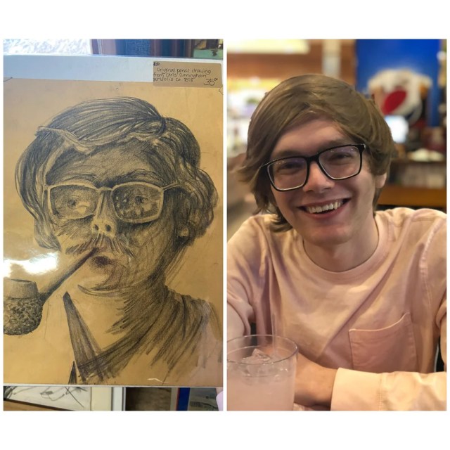 "Thrift store drawing made 22 years before I was born that looks like me as broody fisherman," Carey explained. He came across the portrait, drawn in 1978, in 2024, but didn't think about sharing it until he saw others' posts about similar finds.