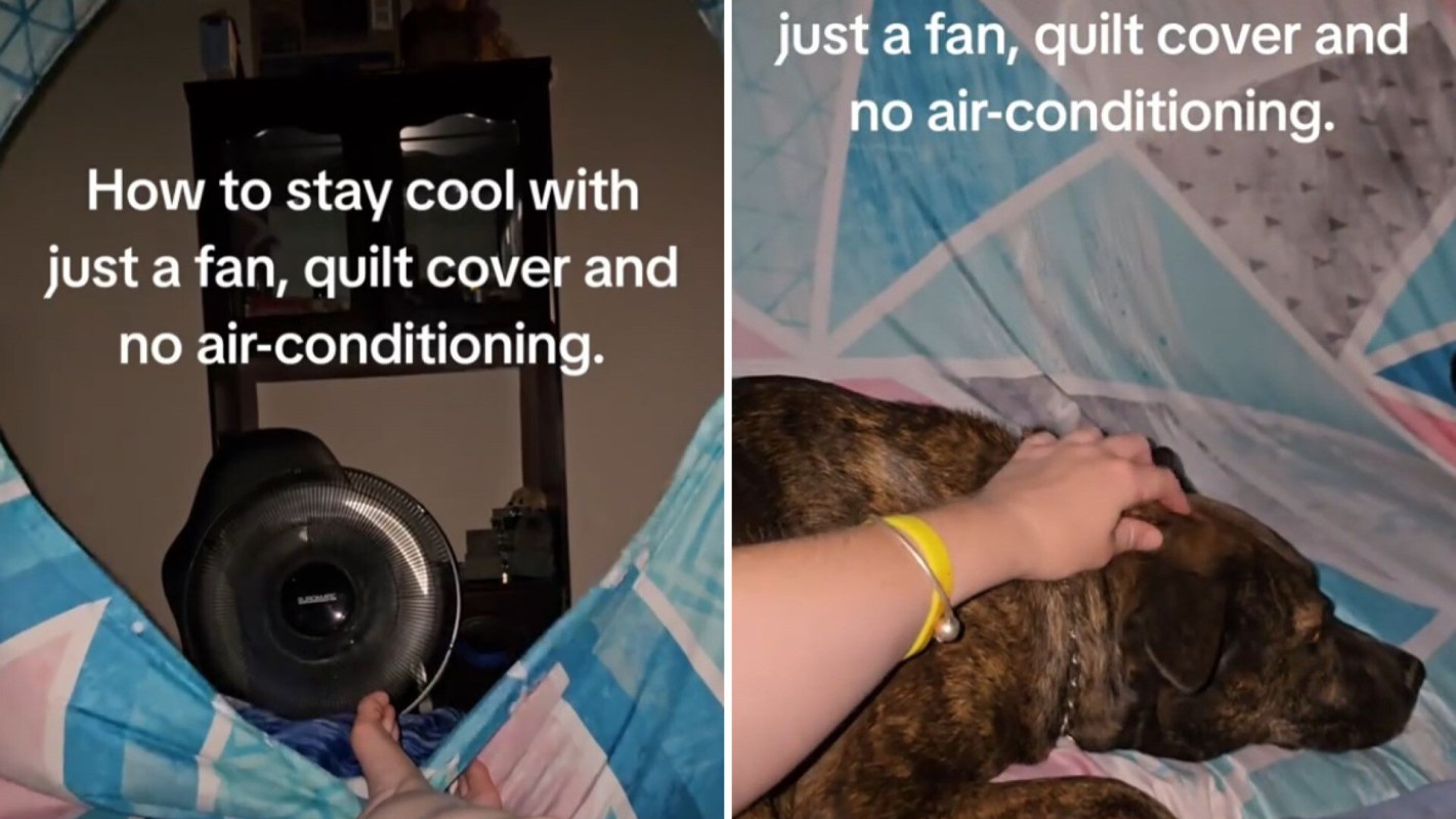 In her video, she shows an open quilt cover or duvet — which is made of a thin material — and is positioned inside it. With a blowing fan pointed toward herself and a dog, the air effectively inflates the duvet into a cool little hideaway.