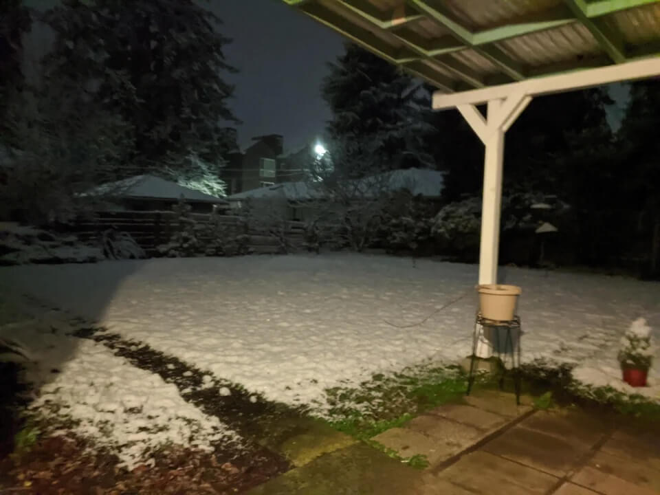 This user's vision for their yard included raised garden beds full of flowers and vegetables. But getting there was a long journey. In their post, they shared a "before" photo from January 2020 featuring an ordinary lawn covered in snow. There were no flowers or garden beds, just a few bushes around the edges and a simple concrete walkway through the middle.
