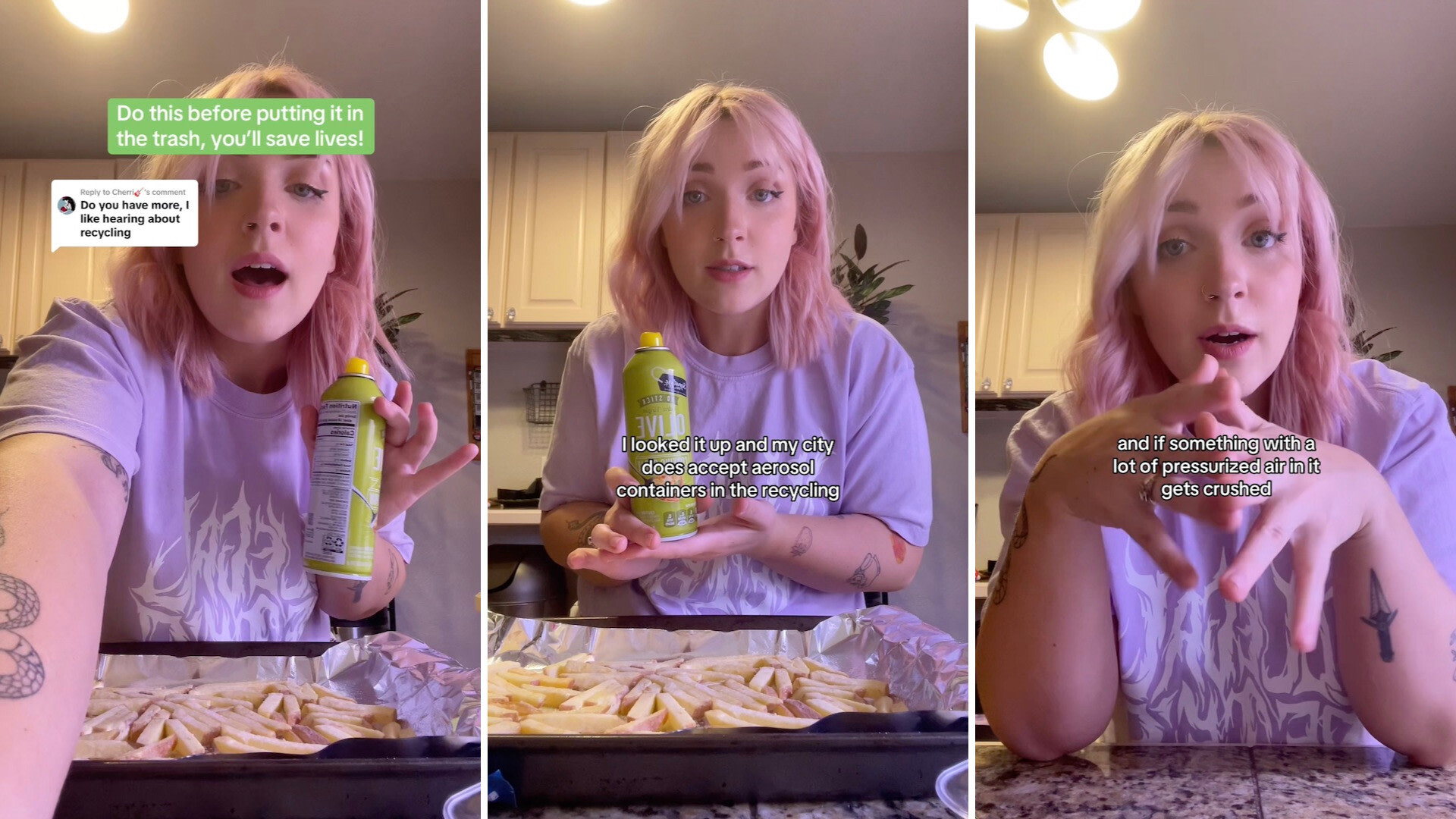 Liz Kuhn (@lizkuhn_), a human rights and changing climate activist, shared a PSA video with her nearly 40,000 TikTok followers on how to recycle those pesky spray oil cans.
