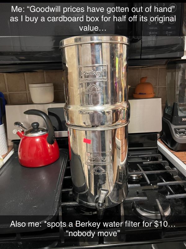 Posting on the subreddit r/ThriftStoreHauls, the shopper wrote that they had picked up a Berkey water filtration system currently worth $260 for next to nothing. The filtration system removes heavy metals, chlorine, and chemicals from tap water while leaving the beneficial minerals behind.