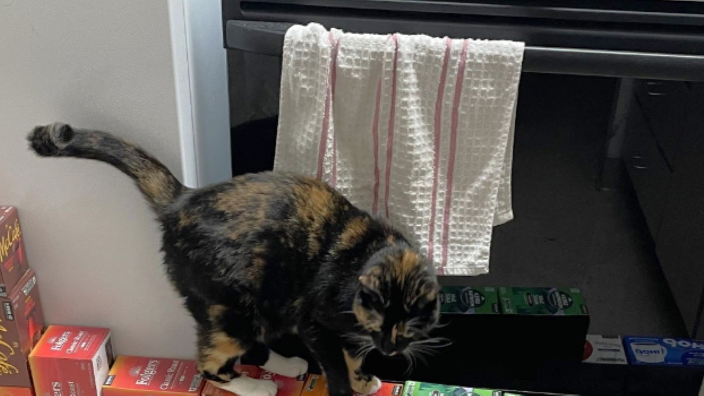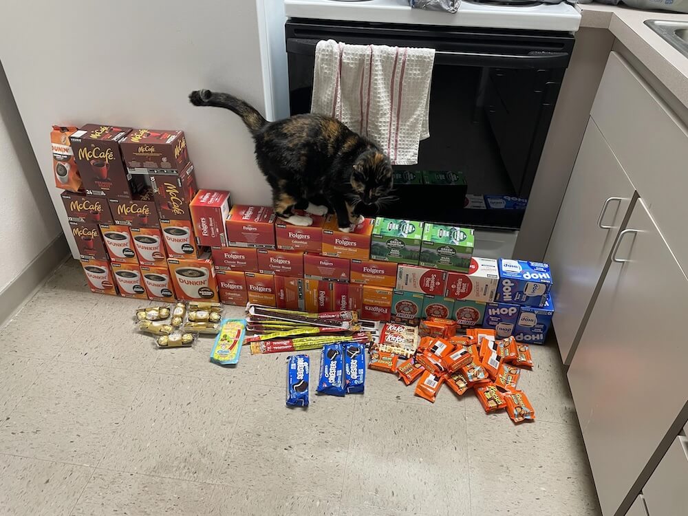 The image showed a wall of 38 boxes of coffee pods with a calico cat standing on them, looking down at about four dozen chocolates and snacks.
