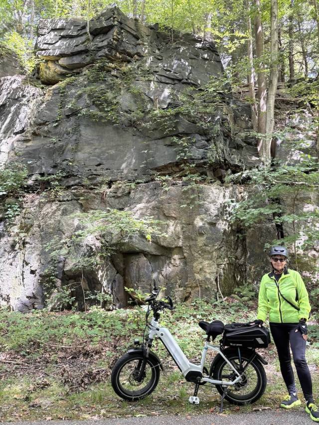 The owner shared a photo of their bike in the r/ebikes subreddit. The image shows a big rock formation in the background, with many trees and greenery. The white e-bike and the owner are in the foreground.