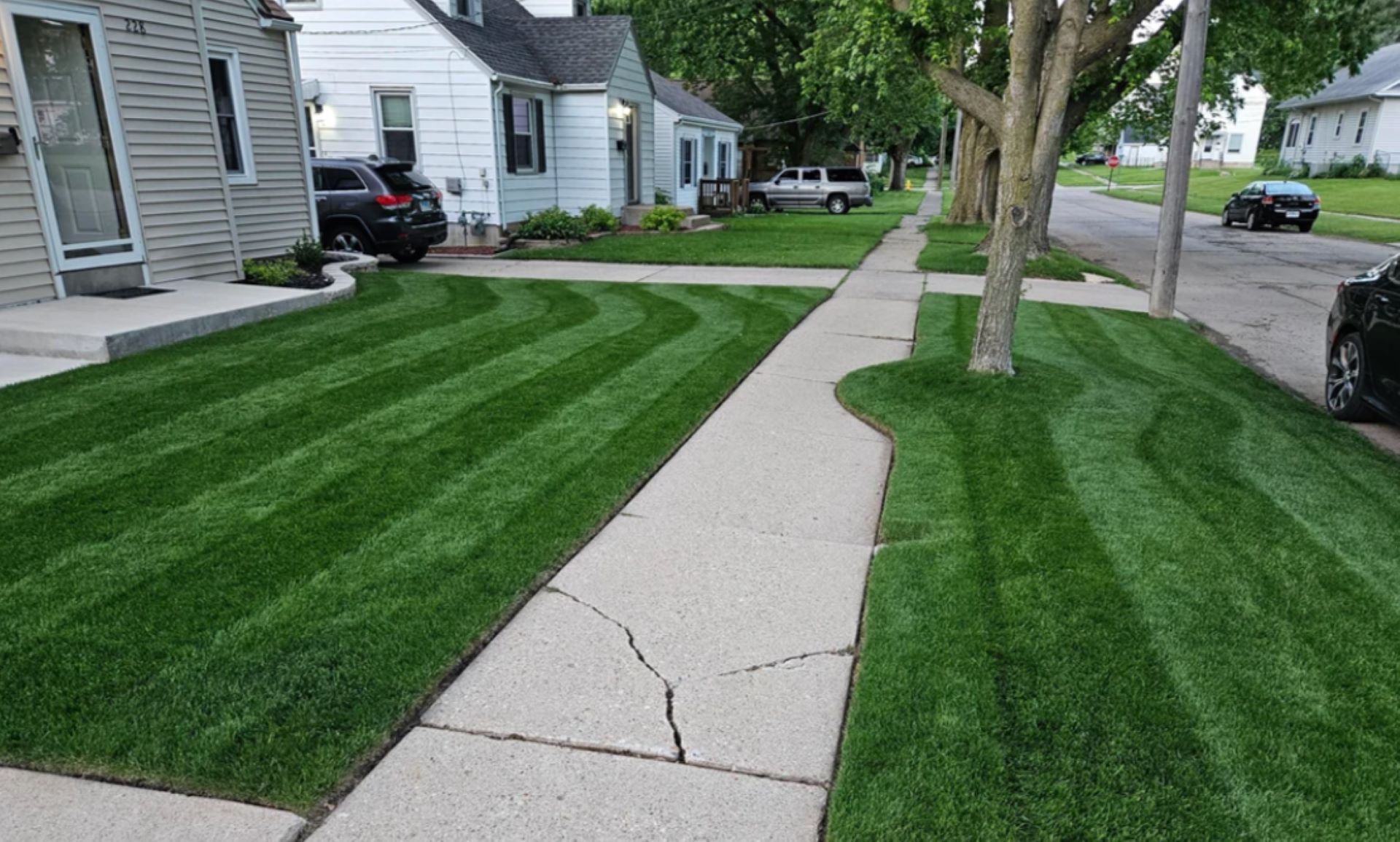 A homeowner shared the results of their lawn after using their electric mower. The images show an evenly cut patch of grass with solid stripes.