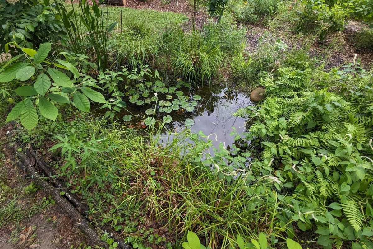 Among the plants in the original poster's frog pond were hazel alder, spicebush, buttonbush, pawpaw, swamp milkweed, and lizard tail. Around the pond's edge, you'd find winged sumac, spotted bee balm, pennywort, and lilypads. All these plants are native to middle Georgia, where the Redditor lives.