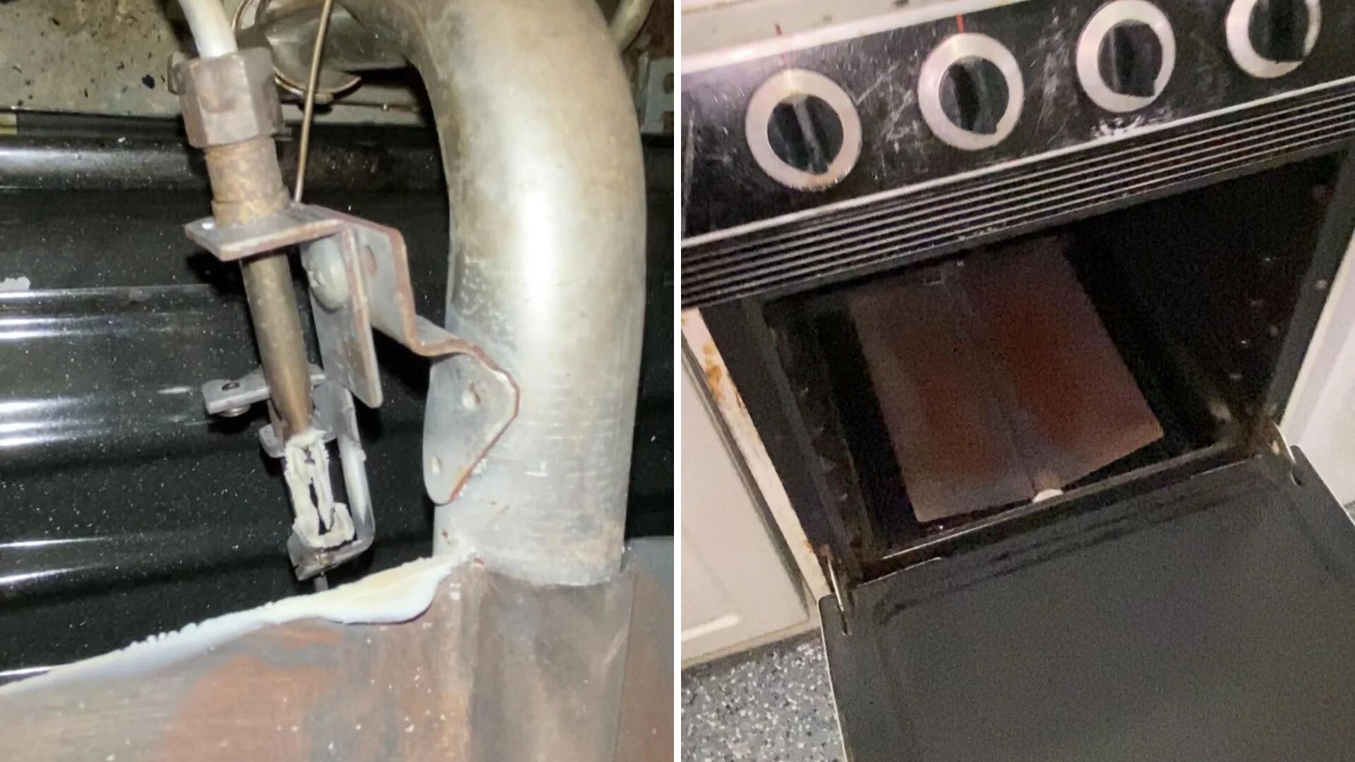 "We've been turning off the gas to the stove between uses due to the gas smell," says the original poster. They then share pictures of a gas fixture inside the stove that appears corroded.
