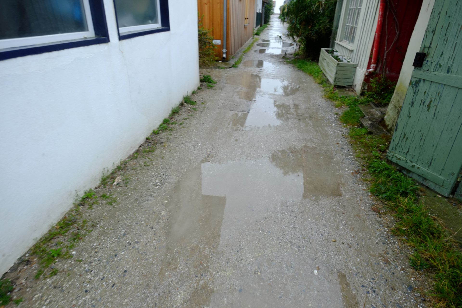 The original poster attached two photos of their problem: one showing the side yard between two homes, complete with mud, dying grass, and a huge puddle, and one showing their front yard, where runoff from the area is eroding the soil and washing it onto their driveway.