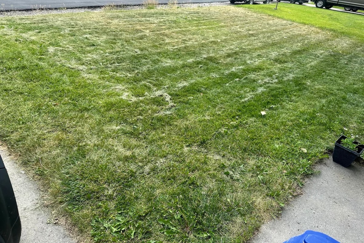 The homeowner explained that they live in a drought-prone area in the Mountain West and got stuck with a Kentucky bluegrass lawn when they bought the house.