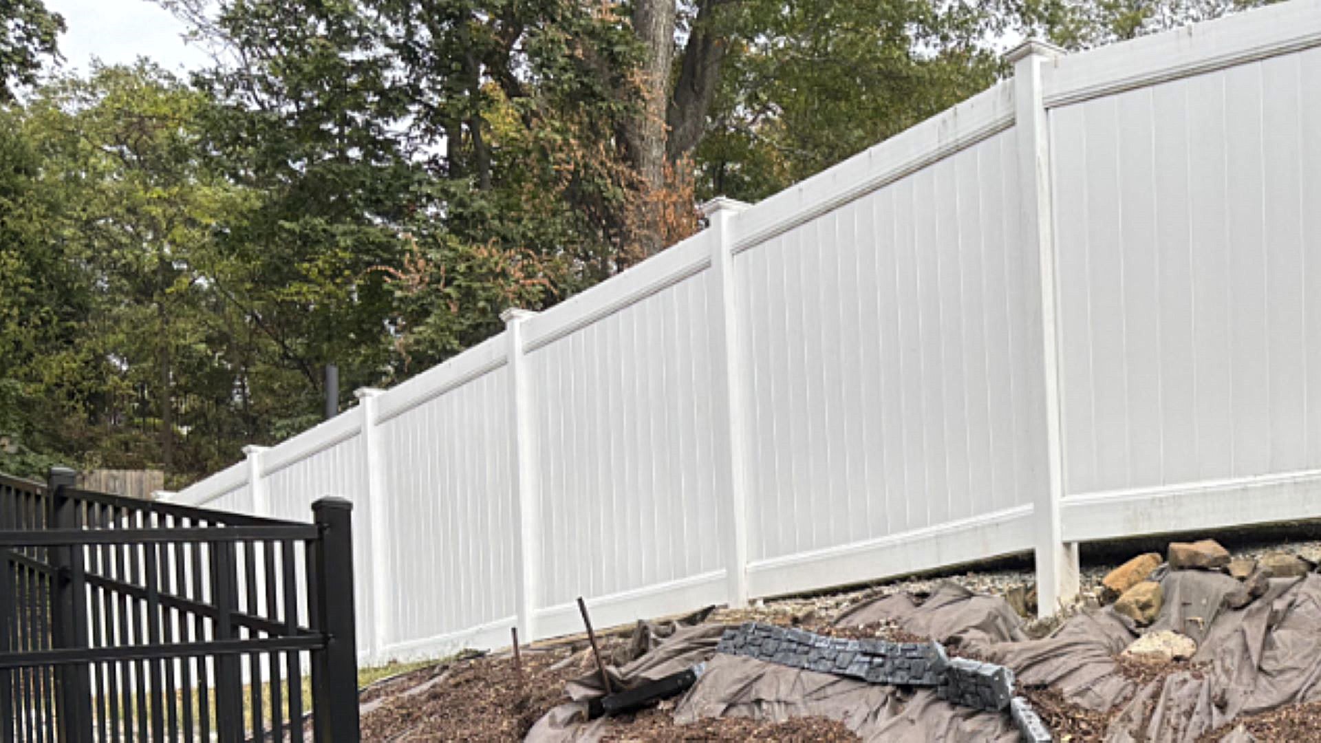 The original poster shared a photo laying out the challenge in detail: a steep slope where their yard and a neighbor's meet, with two fences at different elevations. Throughout the dirt in the slope, we see peeks of rocks and remnants of landscaping fabric struggling to hold the ground in place.