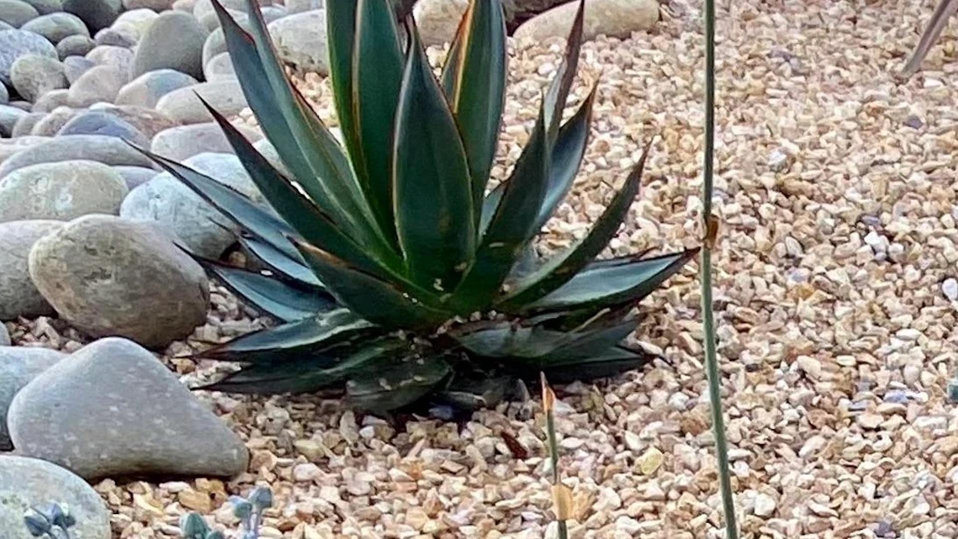 The lawn features mostly succulents with a rock and gravel bed. In response to a comment, the original poster explained that most of the plants were native to Southern California, where they live, as well as Mexico and at least one drought-tolerant species from Australia.