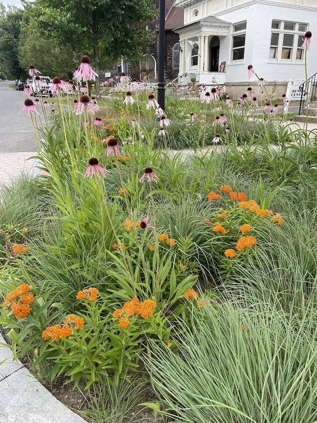 "Native plant garden in town center!" they wrote. "Super effective and simple planting of asclepias tuberosa (butterfly milkweed) and echinacea pallida (pale purple coneflower) in schizachyrium scoparium (little bluestem) matrix. I wish all towns planted this thoughtfully!"
