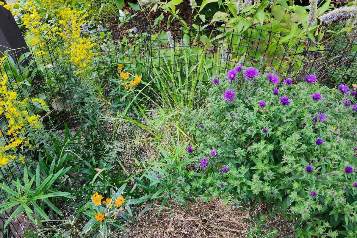 Located in zone 6b in the northeastern U.S., the garden includes purple New York aster, orange butterfly weed, yellow goldenrod, and blue anise hyssop.