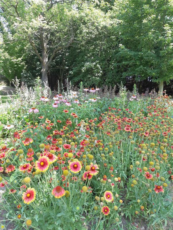 Each of the photos seems to show a different location, with flourishing plants running along roads, lining fences, and tucked in next to stone walls. Examples include gaillardia, coreopsis, woodland poppy, daisies, coneflowers, and more.