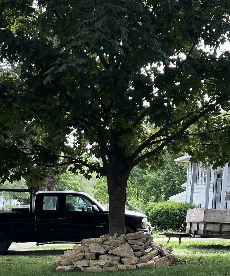 They shared an image in the post, showing at least six layers of rocks circling the single tree, completely covering its base and the surrounding grass.