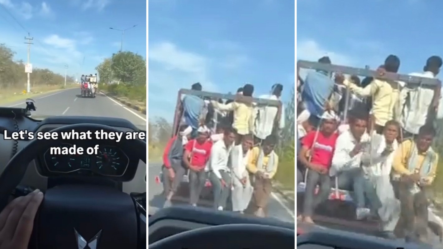 Compounding the problem is how the driver seems to flaunt their privilege of being in a car while the others are stuck riding the back of a truck.