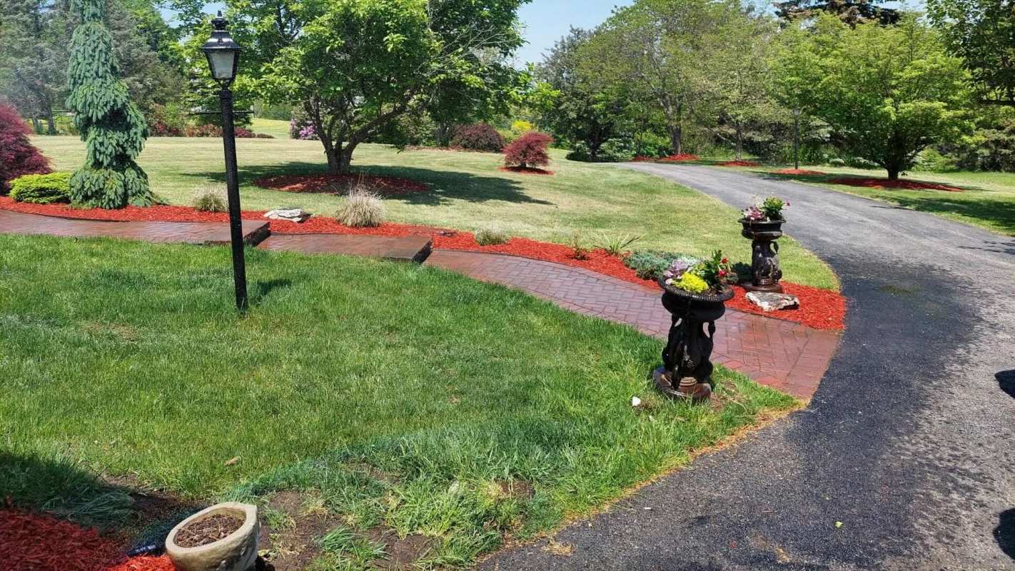 The mulch was used around the base of several trees, as well as around the border of the lawn, where there were several plant beds.