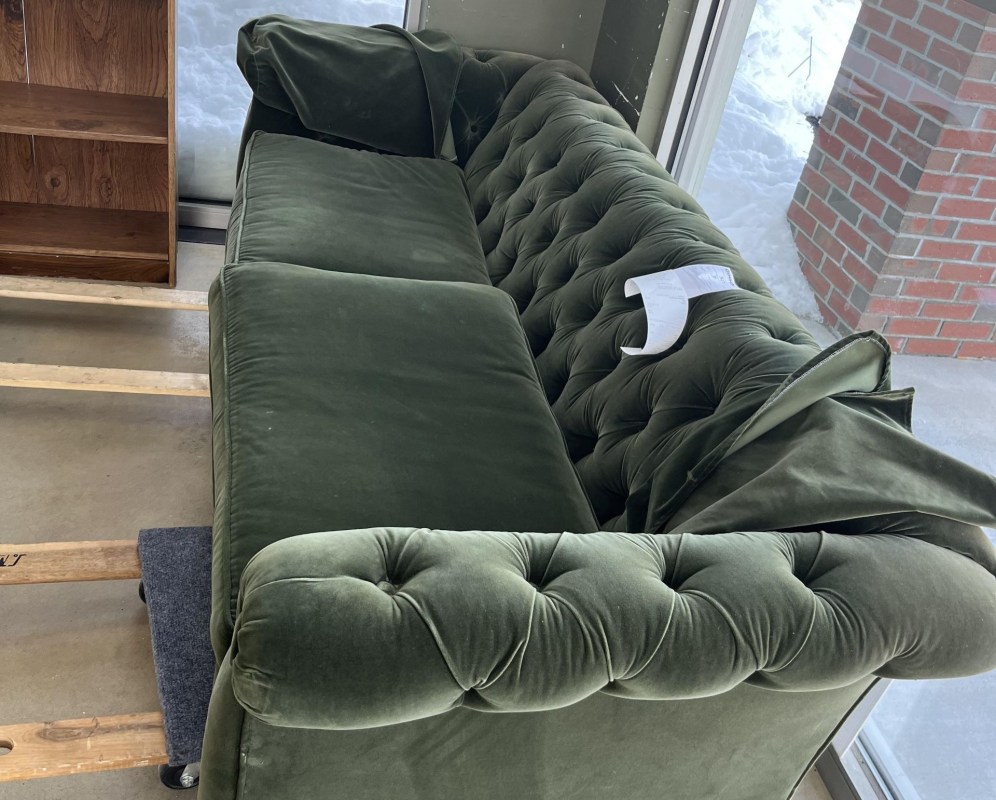 The photo shows the dark blue sofa looking brand new — but not nearly as pricey. New velvet Chesterfields can run thousands of dollars, depending on the brand.