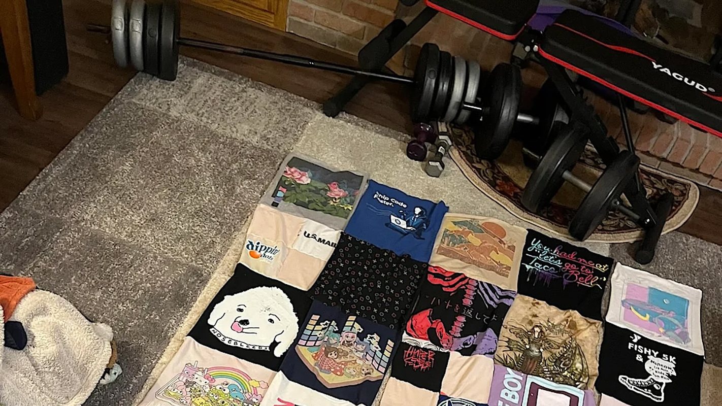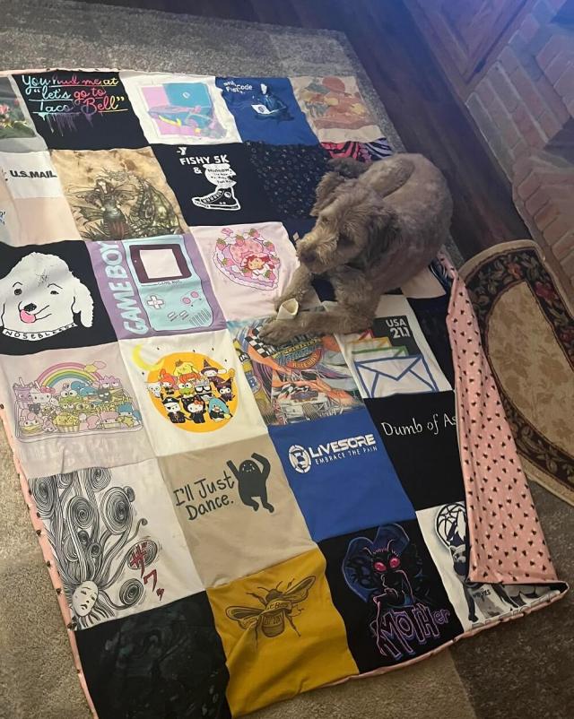 The modest Redditor characterized their skills and the quilt as "pretty basic," and revealed they learned how to use a sewing machine for the project. They also gave a tongue-in-cheek nod to the dog in the photo who "helped." They say the pup will be getting "some tug-of-war rope toys" that they'll fashion out of remaining shirt scraps.