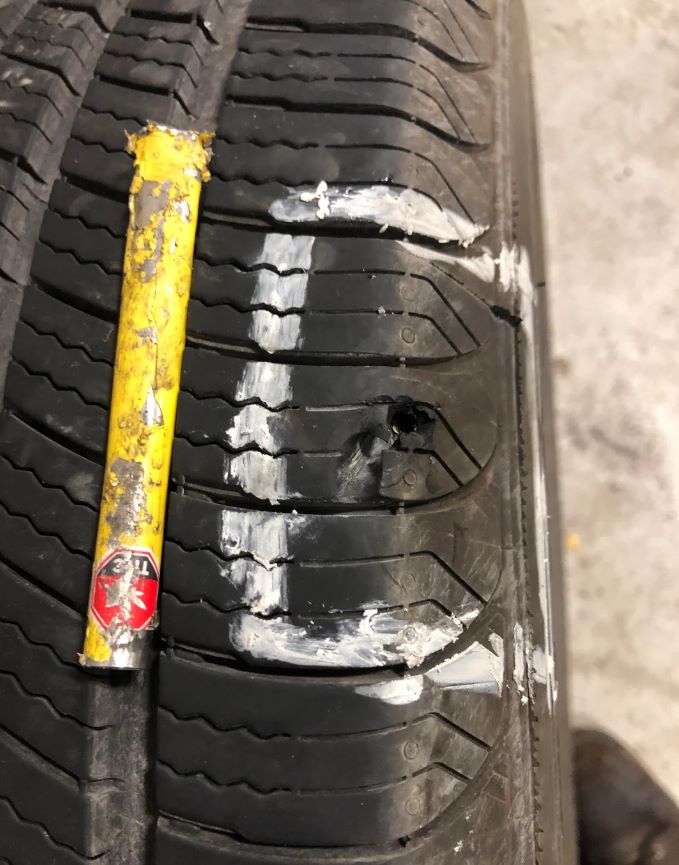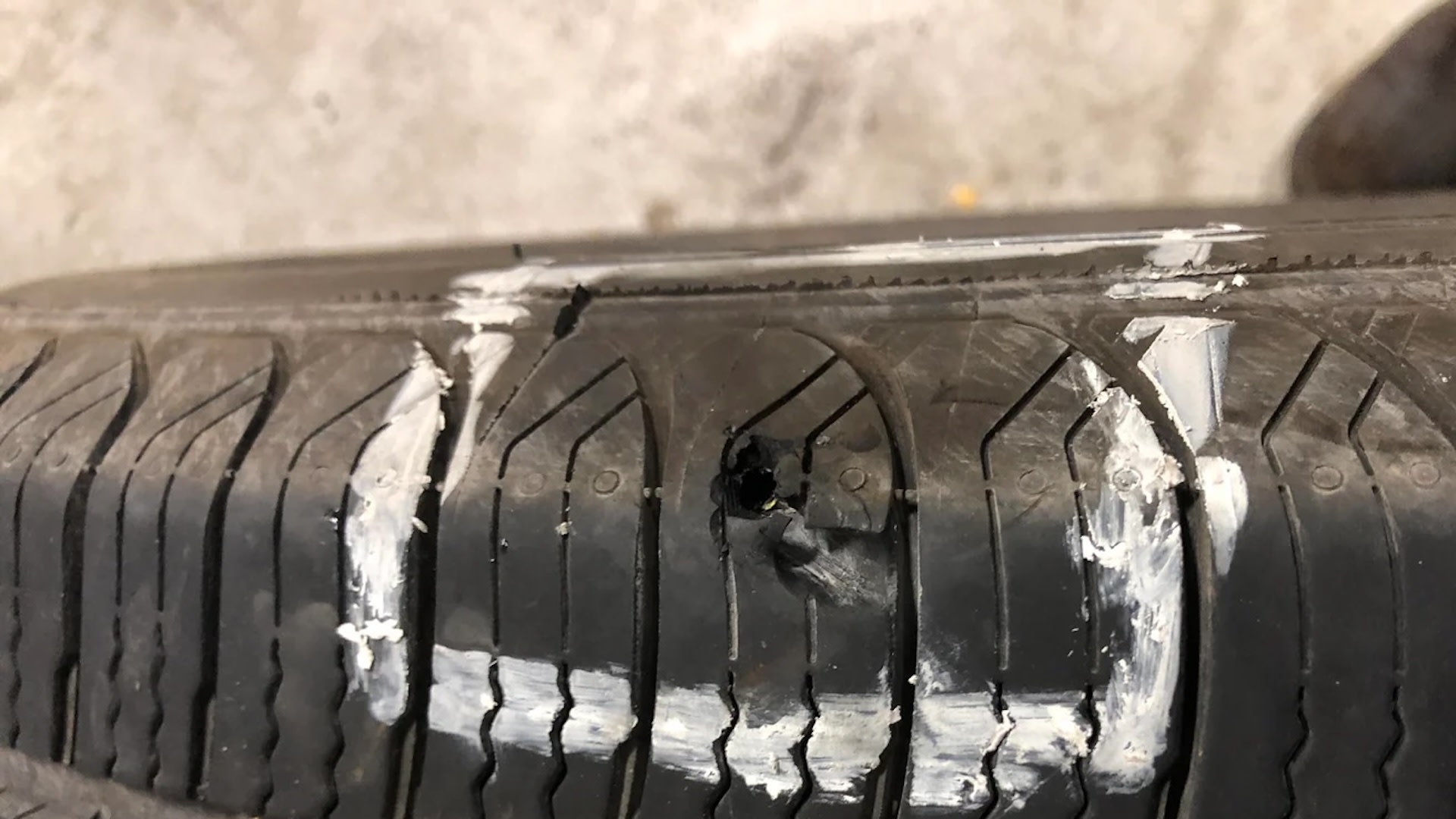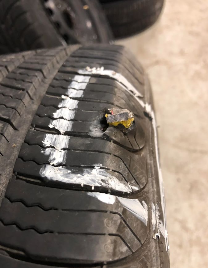 "Yes, that's a THC vape pen," the Redditor wrote, with a photo of a flattened tire. It has a strange object, identified as an e-cigarette, sticking out of it.