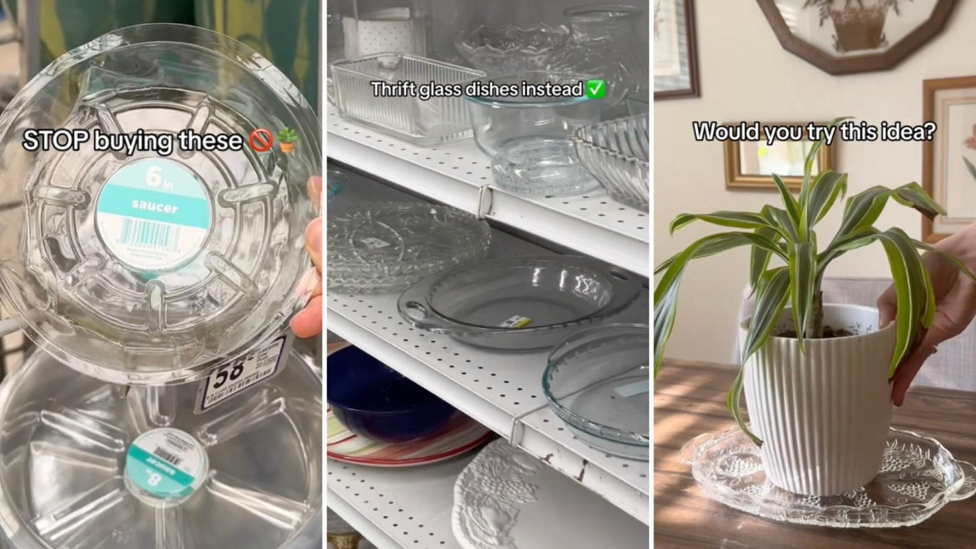 "You have to stop buying these flimsy plastic plant saucers and try thrifting dishes to put underneath your plants instead," the creator said. "They're way more sturdy, they can be cleaned, and they just look so much nicer.
