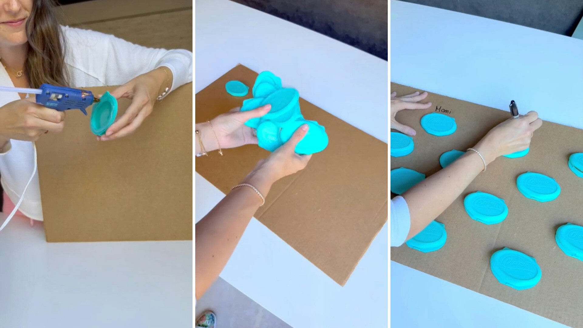In her TikTok video, Myriam Sandler (@mothercould) showed viewers how to create a family board out of old baby wipe lids.