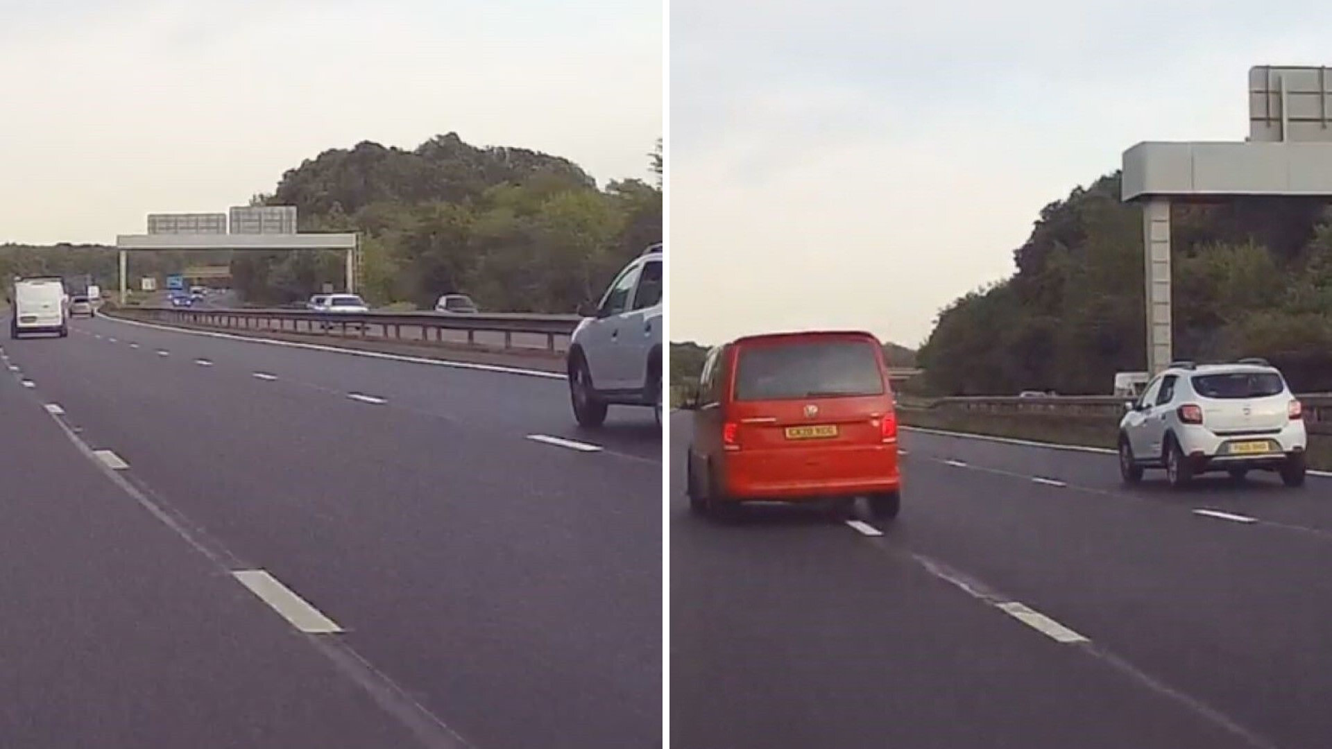 The footage shows a red van weaving in and out of lanes before a separate white car enters the frame. Suddenly, the back window of the white vehicle rolls down, and a passenger hurls what appears to be a vape directly at the driver's car.