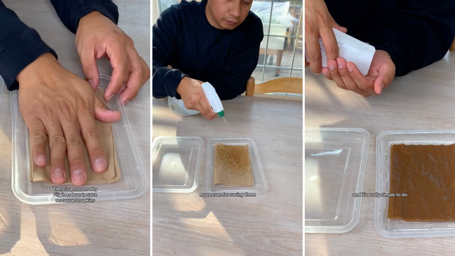 First, soak the napkins evenly with water, sprinkle seeds on top of the napkins (leaving room for them to sprout), and use two takeout container lids to keep the napkins covered.