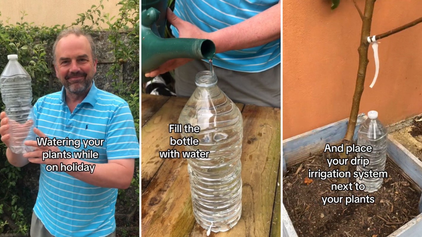In a TikTok video, Simon Akeroyd (@simonakeroydgardener) shows a step-by-step guide on how to water your plants by using recycled materials.