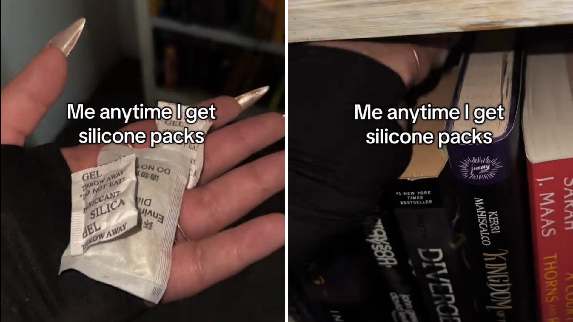 "Me anytime I get silica packets," the user says, as she places them behind the books on her shelf.
