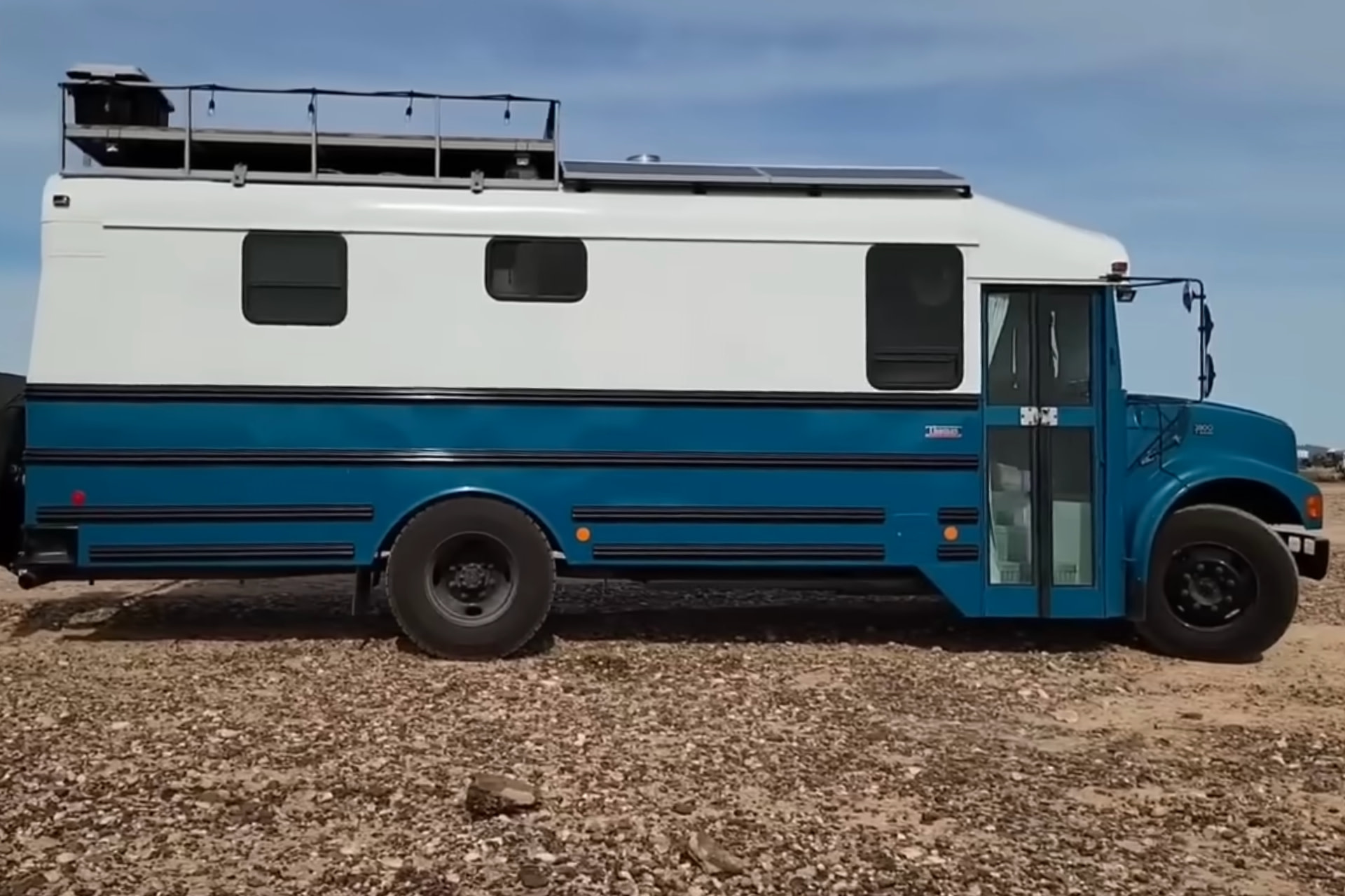 The blue and white 1998 International 3800 school bus with a 7.3 turbo diesel engine was already fully converted when Jaime purchased it and only had 114,000 miles on it.