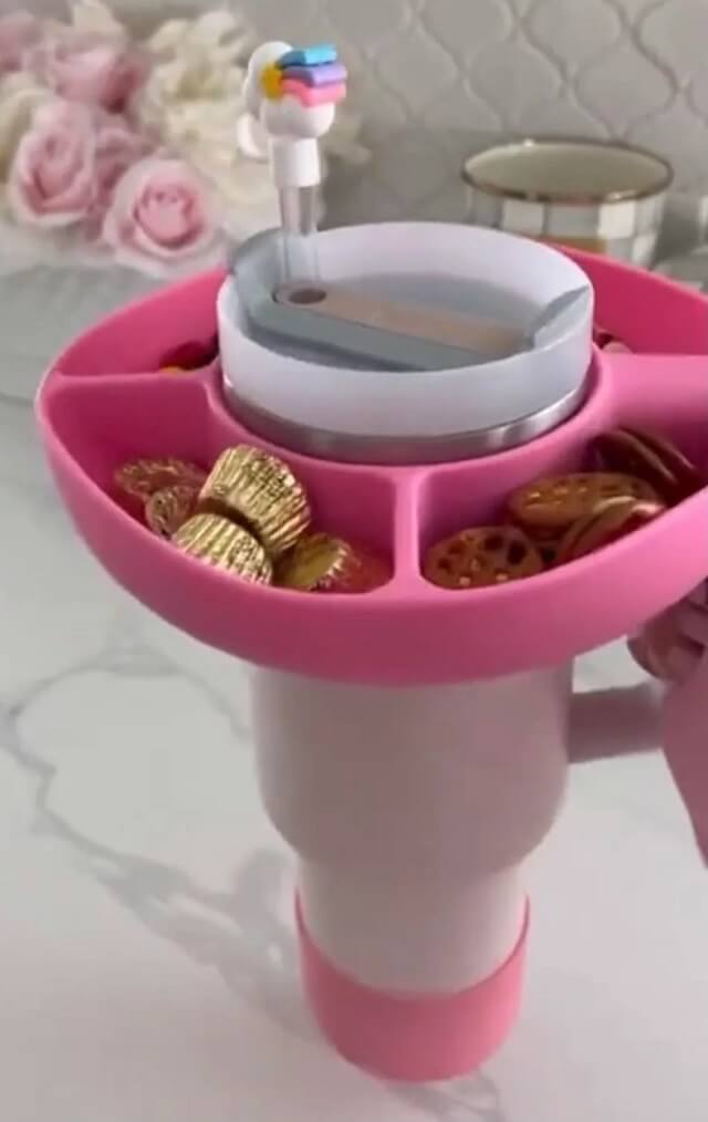 The photos include multiple straw toppers in cute shapes, a custom pouch with a strap for carrying a Stanley cup, a charm that clips onto the handle, and a round snack tray that fits around the rim of the cup.
