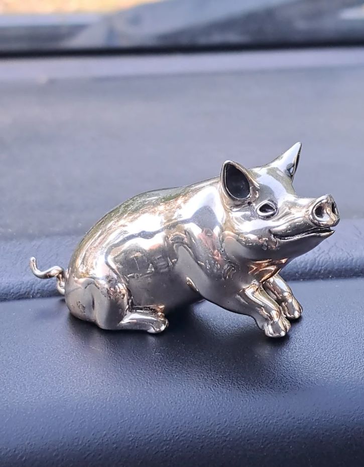 The pig was bought for a bargain price of $4.99, and engraving on the item confirmed that it was sterling silver. The original poster said it weighs 38.9 grams – approximately 1.4 ounces. The current price per ounce of sterling silver is $33.69. Nice come-up after visiting Goodwill!