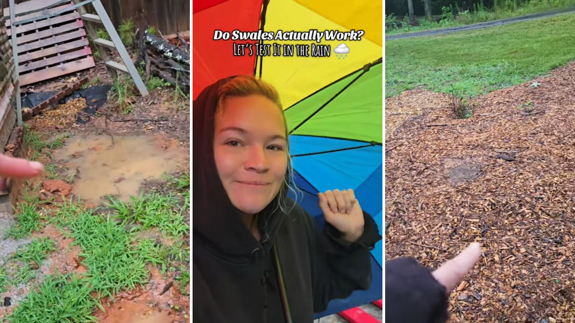 Hygge Haven (@hygge.haven), a gardening coach, shows the effectiveness of her swale drainage systems amid heavy rain.