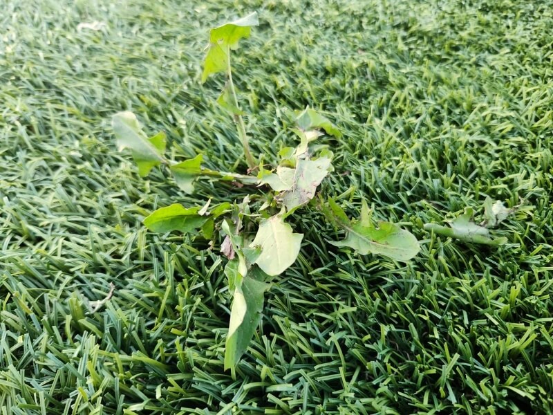 The gardener shared a photo of a patch of synthetic grass with a lone dandelion growing out of it.