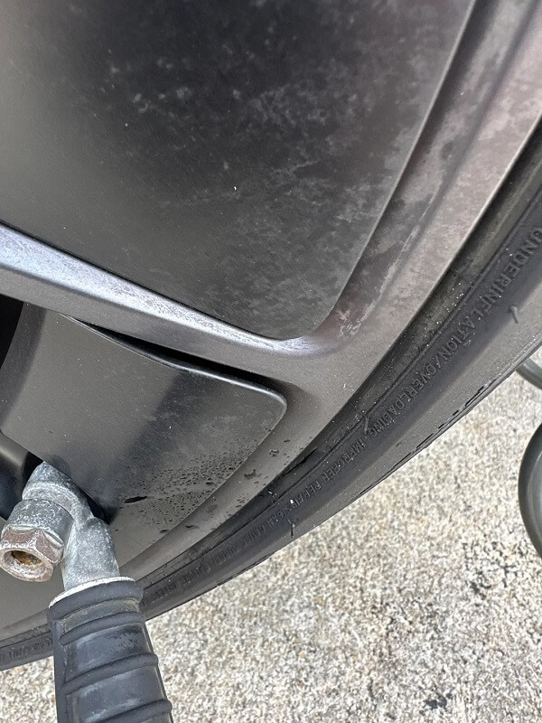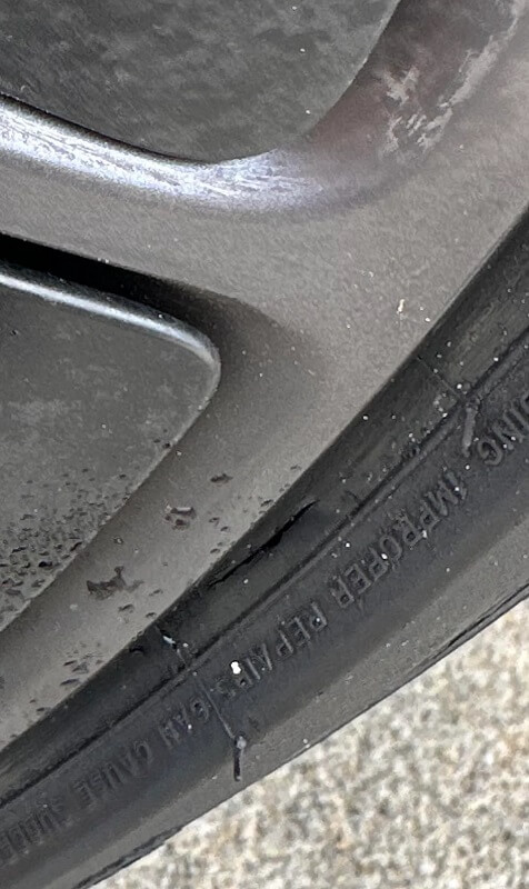 "Got a notification at work that my tire was low, went to look for a nail but couldn't find anything until I went to the pump and found this deep cut," wrote the Tesla driver.