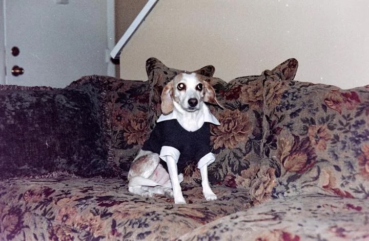 The first two photos show a snowy parking lot and fence that the Redditor suspected might be from Colorado in the early 2000s. The third shows a dog sitting at attention on a couch with a shirt on. In the last, a different dog embraces a woman on a couch holding a Bud Light can.